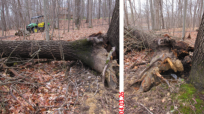Timber! The day before the heaviest rainfall we noticed a fallen large Red Oak tree in our woods. The tree was still alive, but it's base rotted-out (see timber laying flat in image below). Clearing this big old boy out is gonna' take some time ... the trunk diameter is over 24" ... beyond the width of Mike's chainsaw ... it will either required multiple passes, or provide justification to acquire yet another chainsaw. (Presently, Mike's got 3 of 'em.)