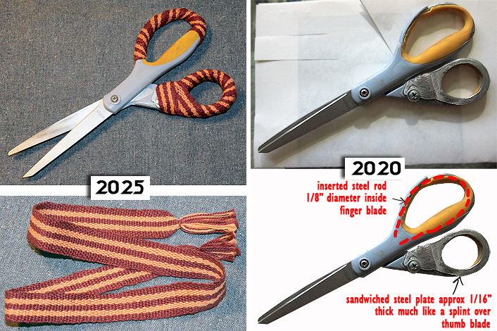 Just Keeps Getting Better! Louise has proven that it's true: things can indeed continue to improve if we humans stay focused on goals and tasks at hand. Case in point: our repaired & repurposed utility scissors we've affectionately dubbed: "Edward Scissorhands" ... five years ago I wrote about the repairs ... how we opted to "fix & retain" these inexpensive scissors rather than just toss 'em in the trash. Yesterday Louise added a striped band of fabric around the thumb and finger holds, covering the rough edges of Mike's 2020 "repairs". Louise used a new Inkle Loom she's recently acquired to make a handsome patch ... which looks like the school colors for Central Michigan University (where Louise & I met). Pretty slick, don'tcha' think? [More Links: to