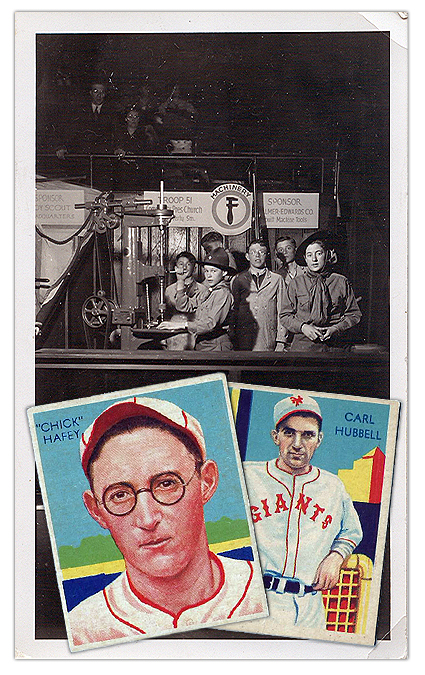 four-eyes!"Fathers teach their kids all sorts of things...big & small. My Dad had plenty of experience wearing eyeglasses...shown in photo to the right, Dad's with his scout troop demonstrating some of the skills they've learned operating a drill press & other tools...and if you didn't guess: he's the handsome fellow in the middle wearing glasses! So when my eye doctor said I needed to wear 'em too at 5-yrs of age, my Dad could relate. He knew glasses could be a pain in the butt, knew all about kids teasing, and could recall when he'd catch hell from his father if he lost or broke his glasses. My Dad never gave me a hard time when that happened to me...the same can't be said for Grace who went bonkers when my specs were broken or misplaced. There are plenty of reasons I opted to hang onto some of his boyhood baseball cards he'd collected during the mid-1930's and eyeglasses like "Chick" Hafey, right, was just one of 'em. Reportedly Hafey one of the few big leaguers to wear glasses while playing. The Hall of Famer Hafey was a fine hitter - sporting a .317 career batting average through 13 seasons with St. Louis and Cincinnati. I recall talking with Dad about these players but can't recall specifics.